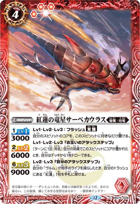自分の「紅蓮」/「ヴルム」が相手のスピリット/アルティメットを破壊したとき、このバトルの間、相手はカードを召喚できない。