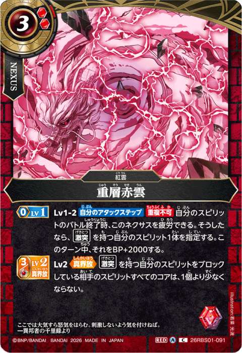 このネクサスを疲労させる▶アタックしている【激突】を持つ自分のスピリット1体を指定する。このバトル中、それをBP+3000する。