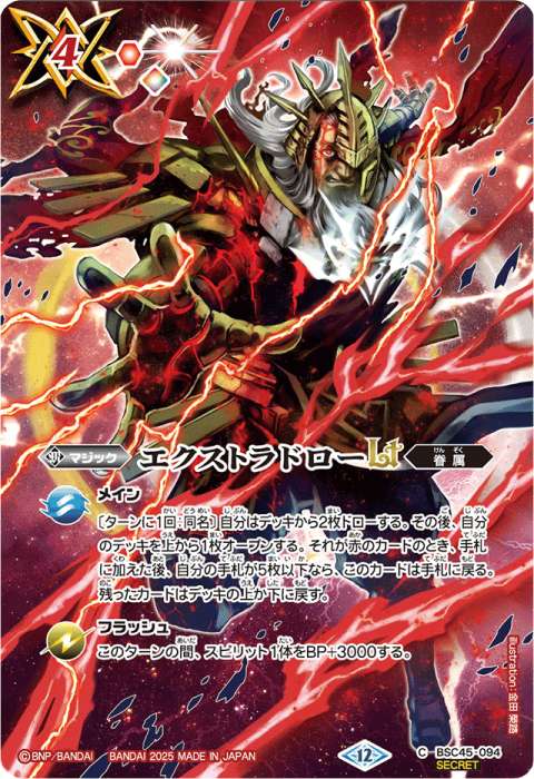マジック 4(赤1全1)/赤/眷属 メイン: 〔ターンに1回:同名〕自分はデッキから2枚ドローする。 その後、自分のデッキを上から1枚オープンする。 それが赤のカードのとき、手札に加えた後、自分の手札が5枚以下なら、このカードは手札に戻る。 残ったカードはデッキの上か下に戻す。 フラッシュ: このターンの間、スピリット1体をBP+3000する。 イラスト:湯本佳典(巡るヒカリ発売記念 ドリームブースター杯 記念品/バトルスピリッツ プレミアム激覇BOX) イラスト:金田榮路(契約編:環 第1章:廻帰再醒 SECRET版) イラスト:ikuyoan(バトスピチャンピオンシップ25-26 スペシャルセット メモリアルスピリット)