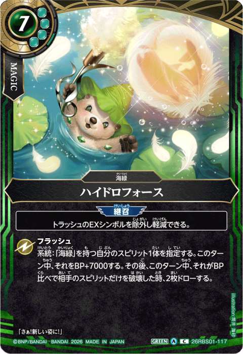 マジック 7(4)/緑/海緑 《継召》 トラッシュのEXシンボルを除外し軽減できる。 フラッシュ: 系統:「海緑」を持つ自分のスピリット1体を指定する。このターン中、それをBP+7000する。 その後、このターン中、それがBP比べで相手のスピリットだけを破壊した時、2枚ドローする。 イラスト:筒井海砂 フレーバーテキスト: 「さぁ!新しい姿に!」