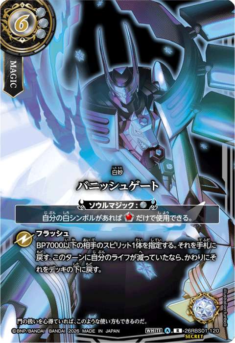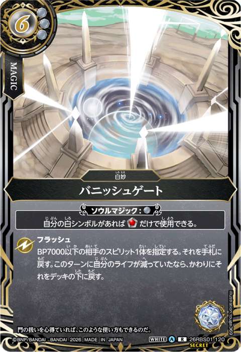マジック 6(3)/白/白妙 《ソウルマジック:[白]》 自分の白シンボルがあれば[ソウルコア]だけで使用できる。 フラッシュ: BP7000以下の相手のスピリット1体を指定する。それを手札に戻す。 このターンに自分のライフが減っていたなら、かわりにそれをデッキの下に戻す。 シンボル:EX白 イラスト:touge369 イラスト:funbolt(SECRET版) イラスト:ロクシロコウシ(プロモーションカード) フレーバーテキスト: 門の扱いを心得ていれば、このような使い方もできるのだ。カード番号:26RBS01-120