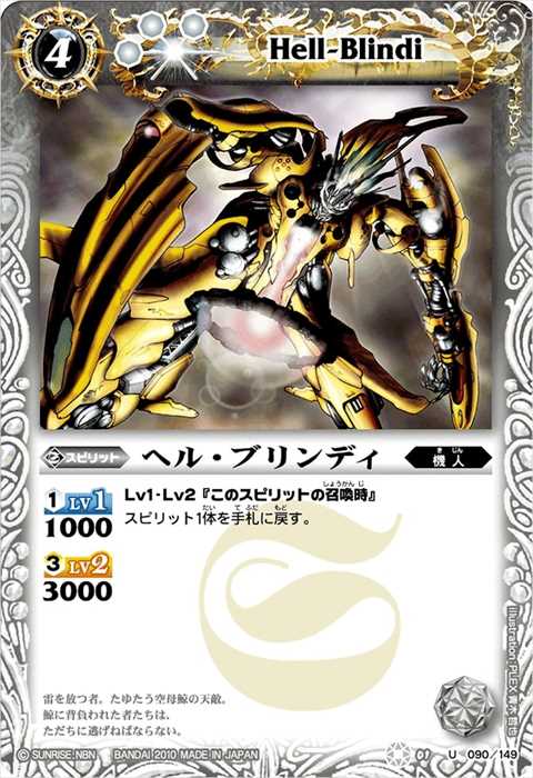 スピリット 4(3)/白/機人 <1>Lv1 1000 <3>Lv2 3000 Lv1・Lv2『このスピリットの召喚時』 相手のスピリット1体を手札に戻す。 召喚コストに[ソウルコア]を使用していたら、さらに、自分のスピリット1体を手札に戻す。 シンボル:白 イラスト:PLEX青木哲也 フレーバーテキスト: 雷を放つ者。たゆたう空母鯨の天敵。 鯨に背負われた者たちは、 ただちに逃げねばならない。