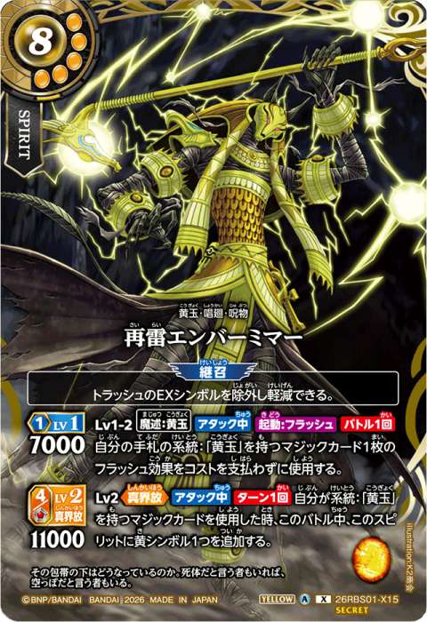 スピリット 8(5)/黄/黄玉・唱廻・呪物 <1>Lv1 7000 <4>Lv2/真界放 11000 《継召》 トラッシュのEXシンボルを除外し軽減できる。 Lv1-2【魔述:黄玉】『アタック中』【起動:フラッシュ】〔バトル1回〕 自分の手札の系統:「黄玉」を持つマジックカード1枚のフラッシュ効果をコストを支払わずに使用する。 Lv2《真界放》『アタック中』〔ターン1回〕 自分が系統:「黄玉」を持つマジックカードを使用した時、このバトル中、このスピリットに黄シンボル1つを追加する。 シンボル:黄 イラスト:K2商会 フレーバーテキスト: その包帯の下はどうなっているのか。死体だと言う者もいれば、 空っぽだと言う者もいる。カード番号:26RBS01-X15