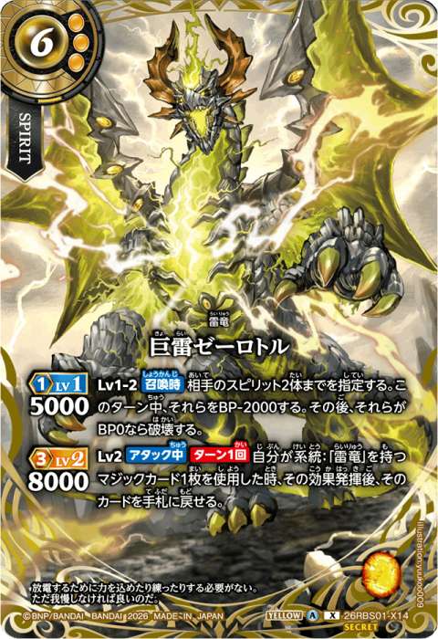 スピリット 6(3)/黄/雷竜 <1>Lv1 5000 <3>Lv2 8000 Lv1-2『召喚時』 相手のスピリット2体までを指定する。このターン中、それらをBP-2000する。その後、それらがBP0なら破壊する。 Lv2『アタック中』〔ターン1回〕 自分が系統:「雷竜」を持つマジックカード1枚を使用した時、その効果発揮後、そのカードを手札に戻せる。 シンボル:黄 イラスト:yuukoo009 フレーバーテキスト: 放電するために力を込めたり練ったりする必要がない。 ただ我慢しなければ良いのだ。カード番号:26RBS01-X14