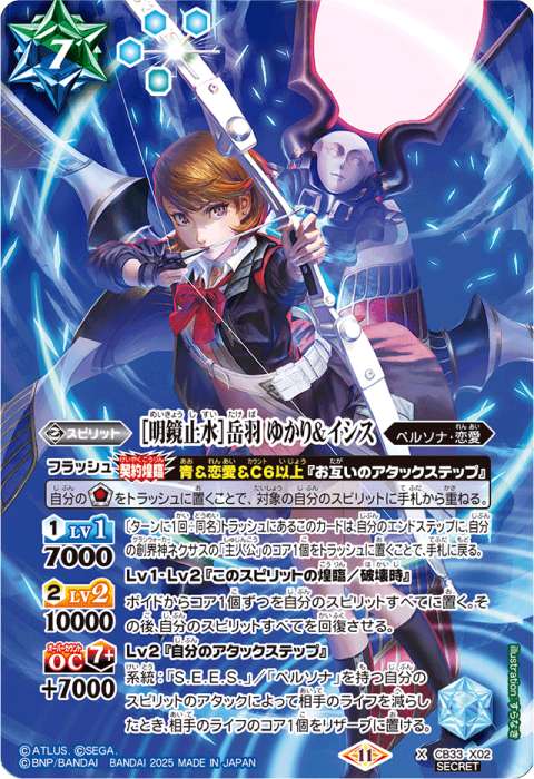 スピリット 7(青3緑1)/青緑/ペルソナ・恋愛 <1>Lv1 7000 <2>Lv2 10000 OC<7+>+7000 フラッシュ《契約煌臨:青&恋愛&C6以上》『お互いのアタックステップ』 自分の[ソウルコア]をトラッシュに置くことで、対象の自分のスピリットに手札から重ねる。 〔ターンに1回:同名〕トラッシュにあるこのカードは、自分のエンドステップに、自分の創界神ネクサスの「主人公」のコア1個をトラッシュに置くことで、手札に戻る。 Lv1・Lv2『このスピリットの煌臨/破壊時』 ボイドからコア1個ずつを自分のスピリットすべてに置く。 その後、自分のスピリットすべてを回復させる。 Lv2『自分のアタックステップ』 系統:「S.E.E.S.」/「ペルソナ」を持つ自分のスピリットのアタックによって相手のライフを減らしたとき、相手のライフのコア1個をリザーブに置ける。 シンボル:青 イラスト:すらなきカード番号:CB33-X02