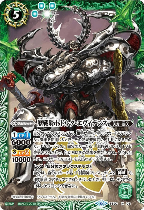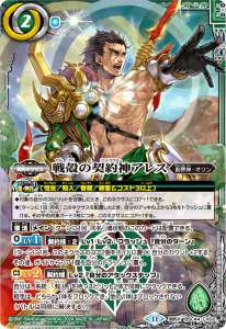 自分のスピリットが同時にアタックしている間、相手が手札/手元のカードを使用したとき、自分のカウント6以上なら、その効果発揮前に、手札にあるこのカードをオープンし、自分の創界神ネクサスの「アレス」1つを疲労させることで、ただちにその効果を無効にする。