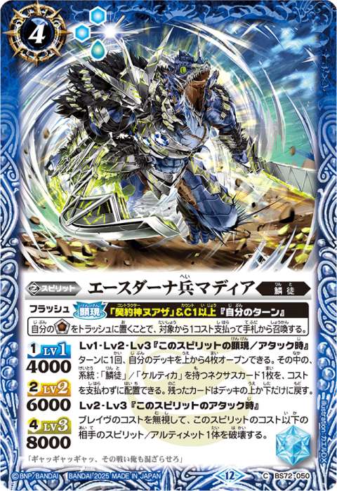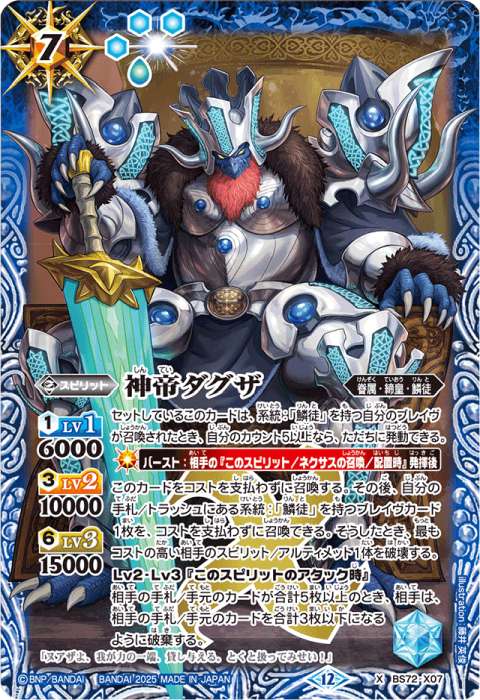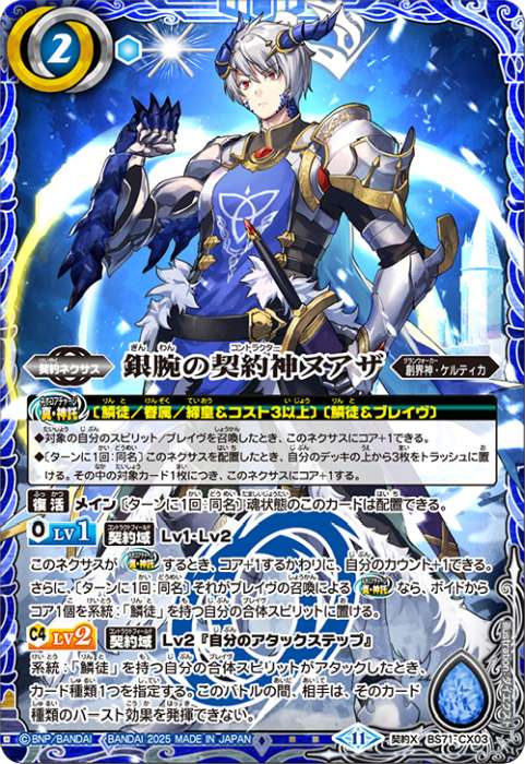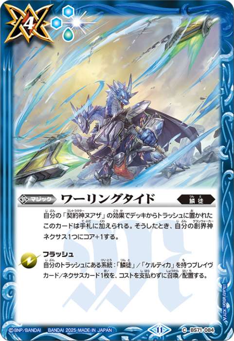 系統:「鱗徒」を持つ自分の合体スピリットがアタックしたとき、自分の創界神ネクサスの「ヌアザ」のコア3個をこのスピリットに置ける。